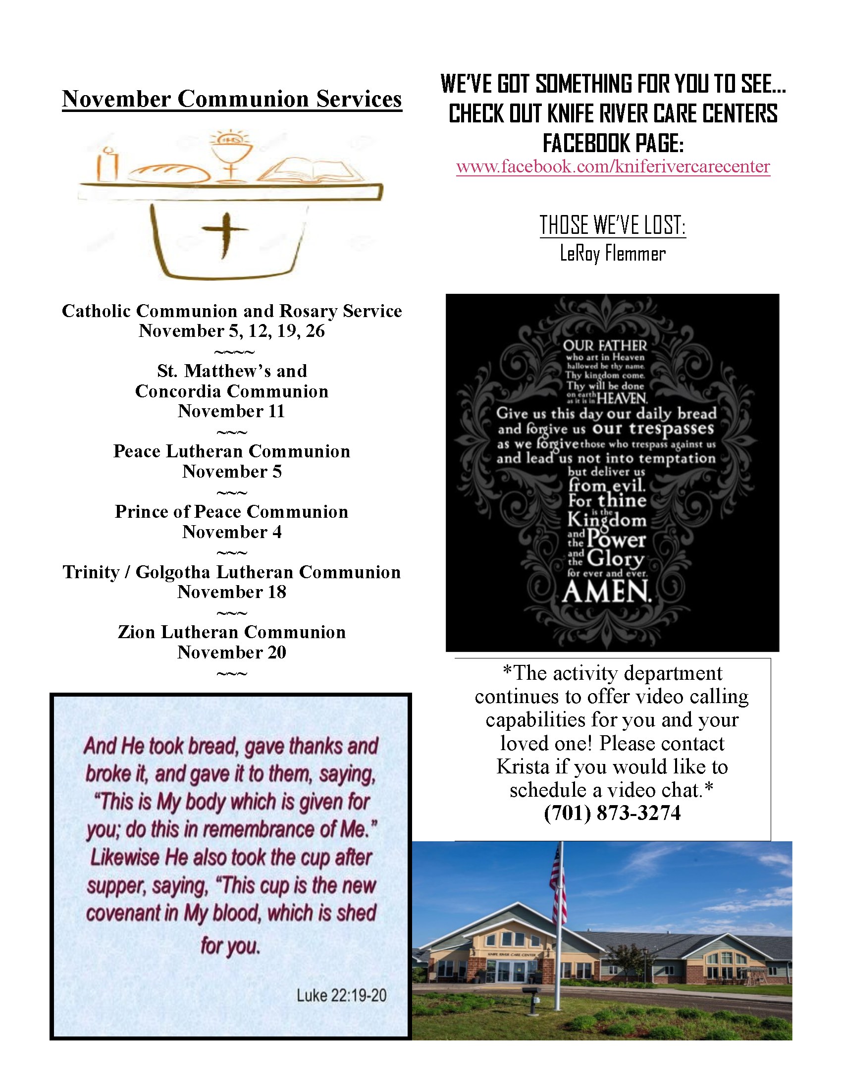 Have you ever thought about volunteering at Knife River Care Center? If you are interested, please stop by the Activity Office to pick-up a Volunteer Application or contact Krista Baytosh at (701) 873-3274. There are a variety of services that we could use assistance with. If you like to play the Wii, board games, play cards, read to the residents, visit in the German language, clean out flower beds, bake cookies, these are just a few of the ideas that you could assist us with. We look forward to seeing you!