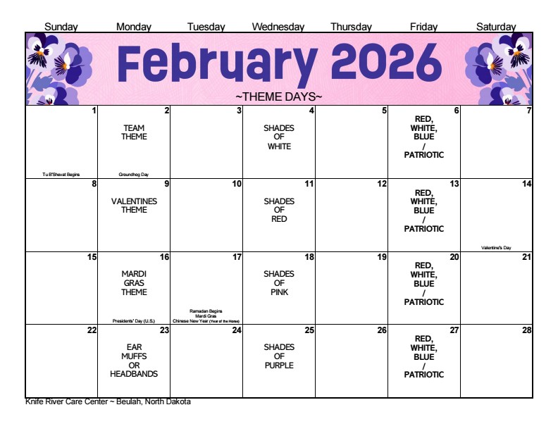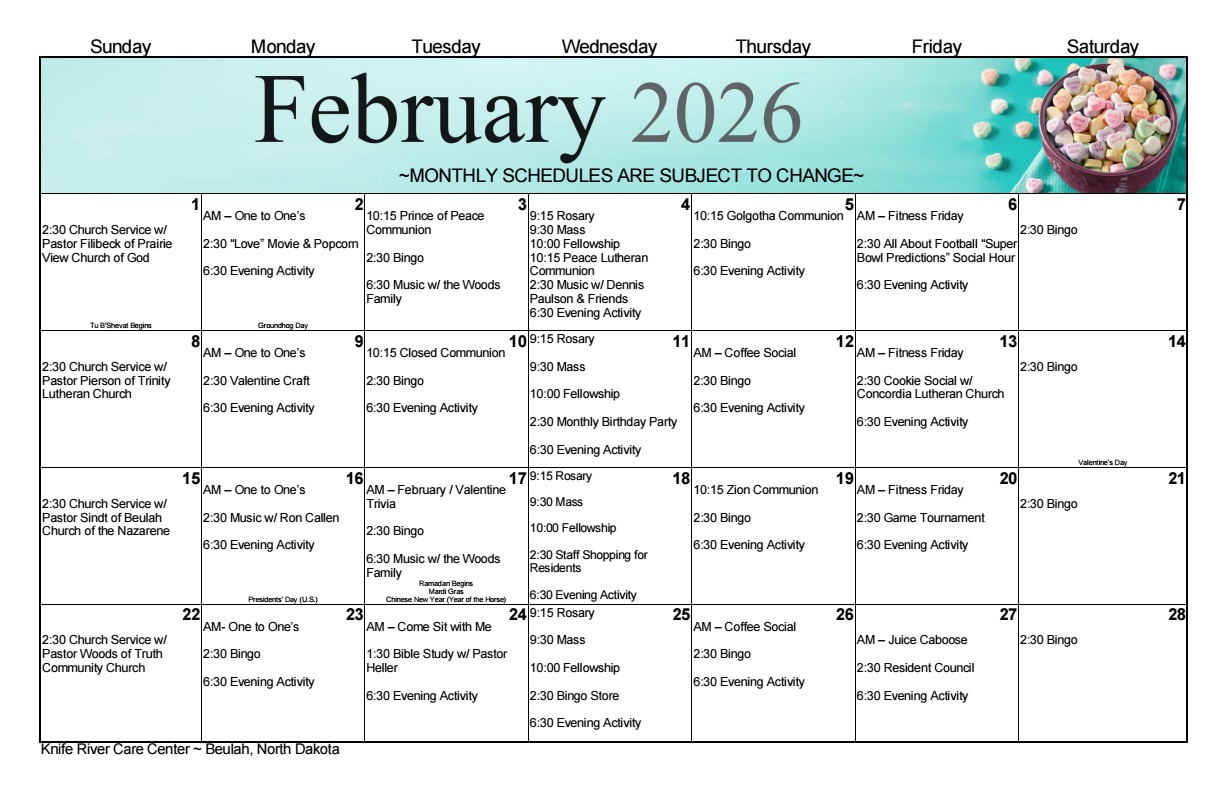 Have you ever thought about volunteering at Knife River Care Center? If you are interested, please stop by the Activity Office to pick-up a Volunteer Application or contact Krista Baytosh at (701) 873-3274. There are a variety of services that we could use assistance with. If you like to play the Wii, board games, play cards, read to the residents, visit in the German language, clean out flower beds, bake cookies, these are just a few of the ideas that you could assist us with. We look forward to seeing you!