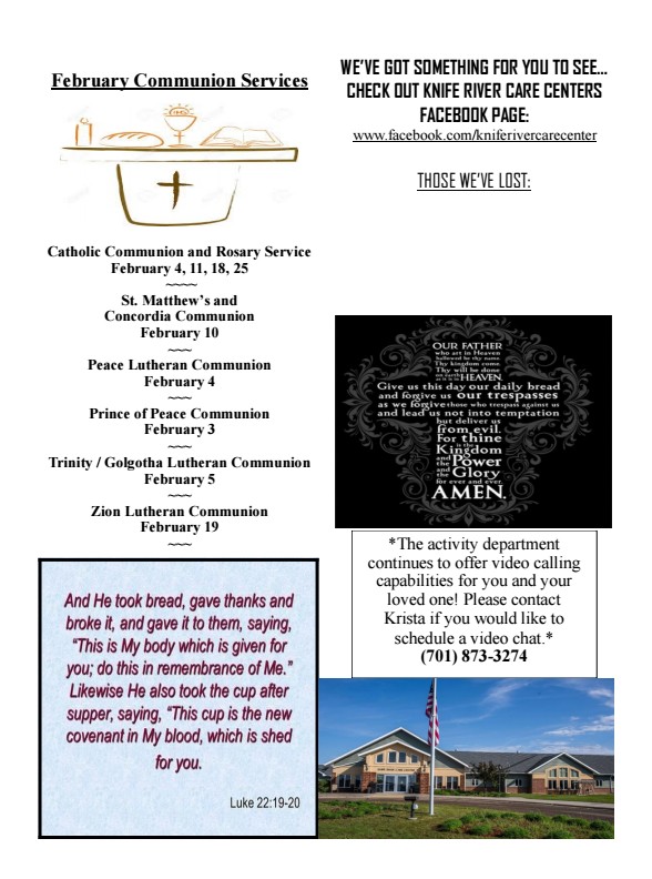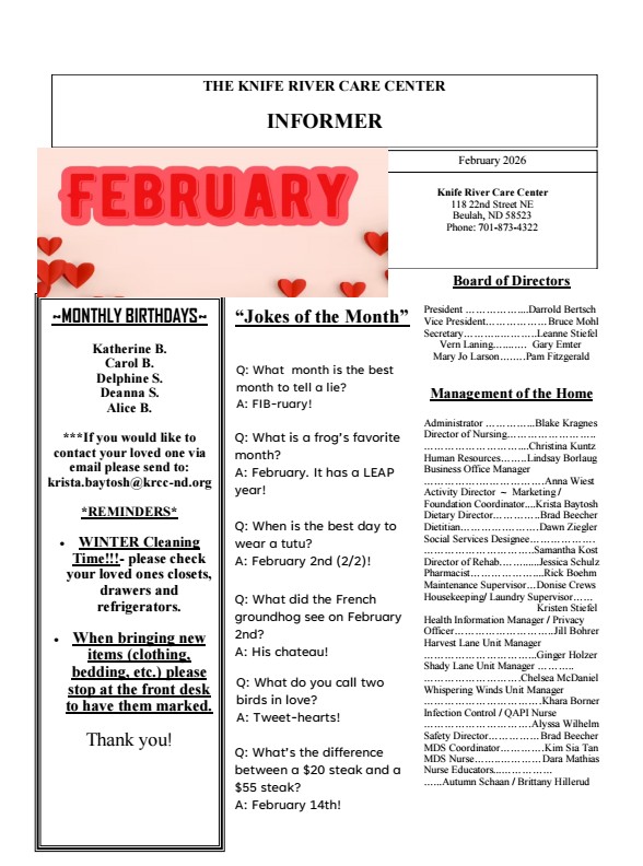 Have you ever thought about volunteering at Knife River Care Center? If you are interested, please stop by the Activity Office to pick-up a Volunteer Application or contact Krista Baytosh at (701) 873-3274. There are a variety of services that we could use assistance with. If you like to play the Wii, board games, play cards, read to the residents, visit in the German language, clean out flower beds, bake cookies, these are just a few of the ideas that you could assist us with. We look forward to seeing you!